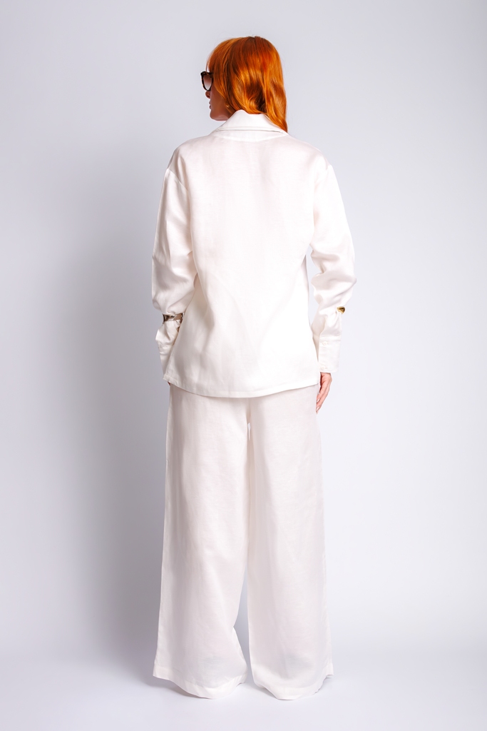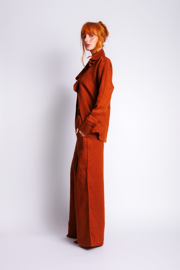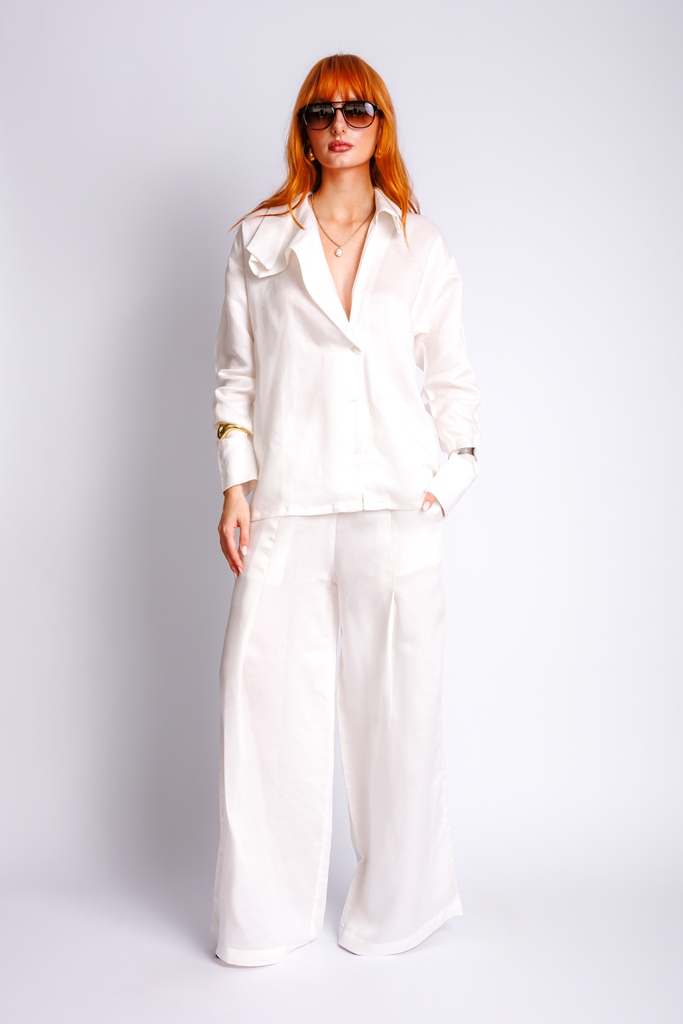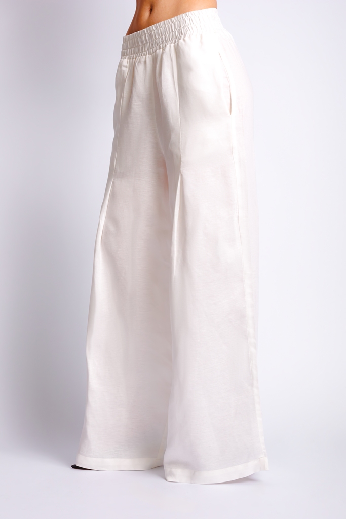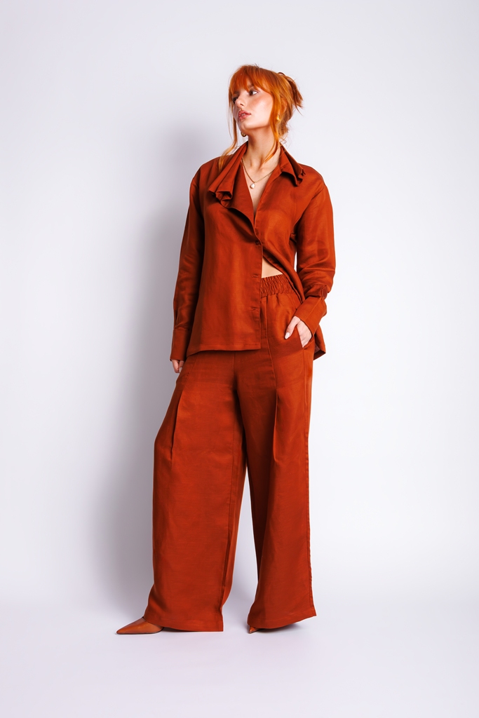 Calça de linho com decote em dobras.