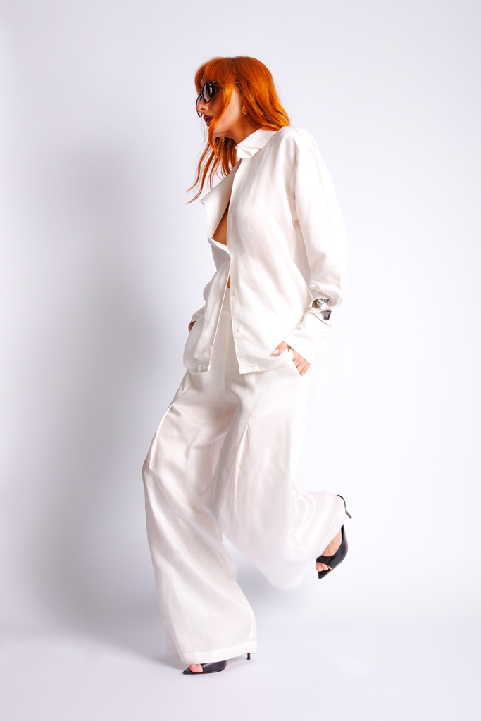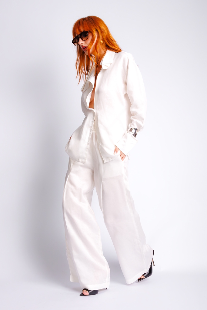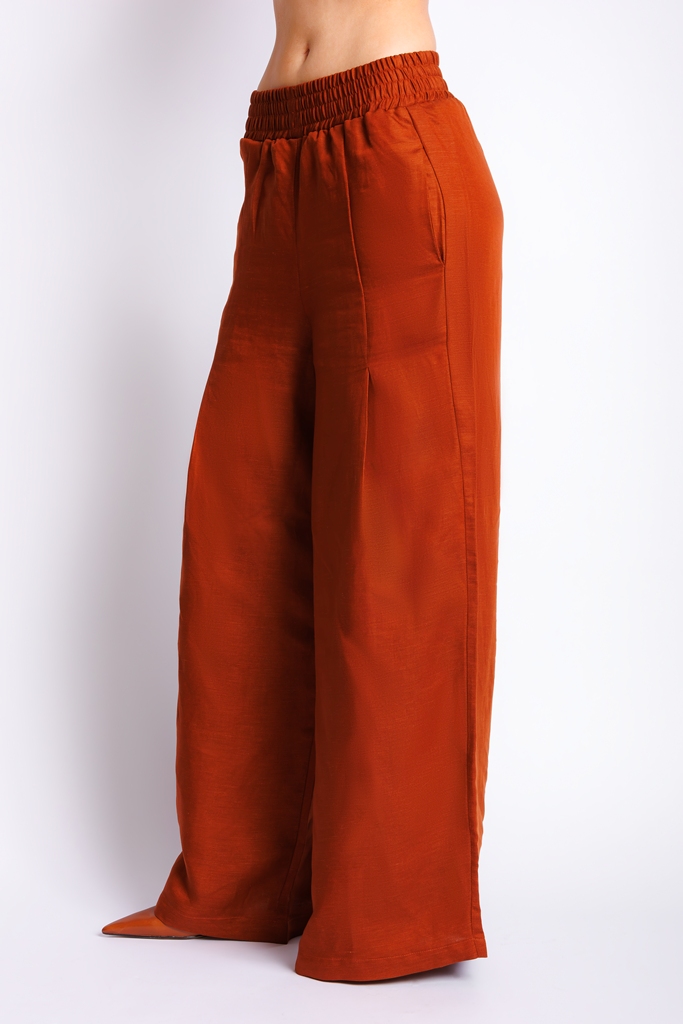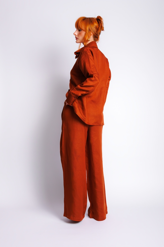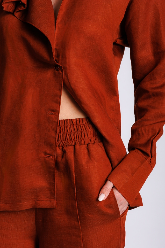 Calça de linho com decote em dobras.